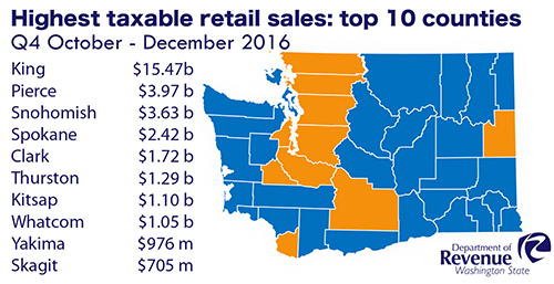 OLYMPIA - May 10, 2017 - Shoppers in a spending mood during the holidays helped boost the state’s taxable retail sales by 6.4 percent in the fourth quarter of 2016 over the same period in 2015, reaching $38.2 billion.