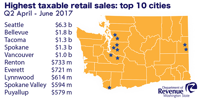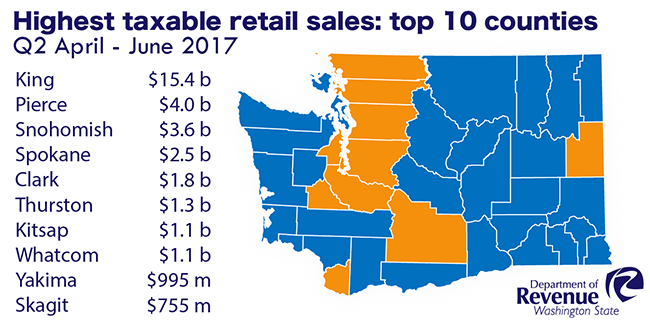 These figures are part of a quarterly report released today by the Washington State Department of Revenue (Revenue). The taxable retail sales figures compare the same quarter year-over-year to equalize any seasonal effects that would influence consumer and business spending.