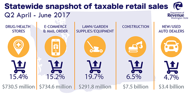 OLYMPIA – Nov. 16, 2017 – Seasonal growth in sales of lawn and garden equipment and continued increases in drug and health store sales helped boost second-quarter taxable retail sales 5 percent over the same period in 2016, reaching a total of $38.6 billion.