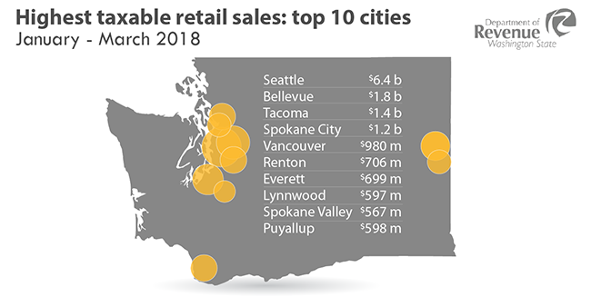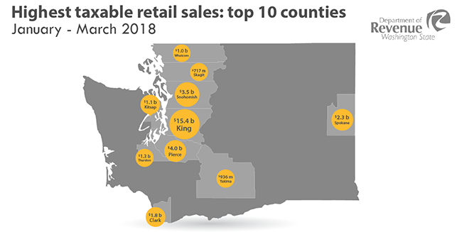 These figures are part of a quarterly report released today by the Washington State Department of Revenue. The taxable retail sales figures compare the same quarter year-over-year to equalize any seasonal effects that would influence consumer and business spending.