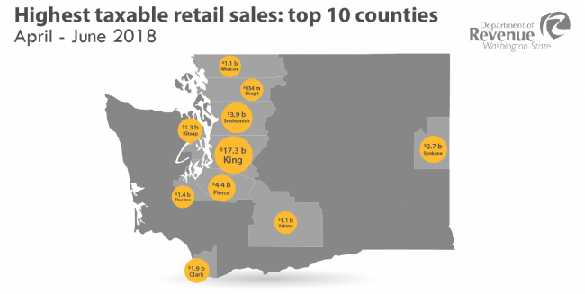 These figures are part of a quarterly report released today by the Washington State Department of Revenue. The taxable retail sales figures compare the same quarter year-over-year to equalize any seasonal effects that would influence consumer and business spending.