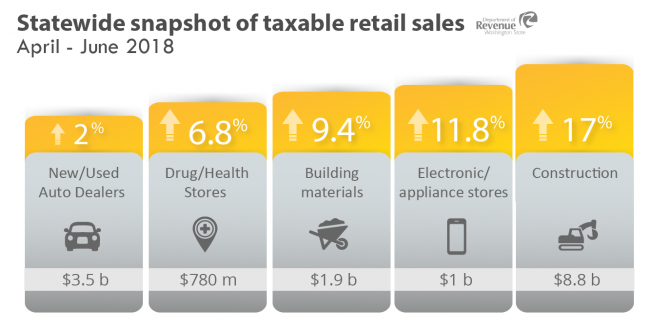 OLYMPIA, WASH. – Nov. 19, 2018 – A 17 percent jump in construction and increased sales of building materials helped boost the state’s taxable retail sales in the second quarter of 2018. The sales increased by 10.6 percent over the same period in 2017, reaching $42.7 billion.