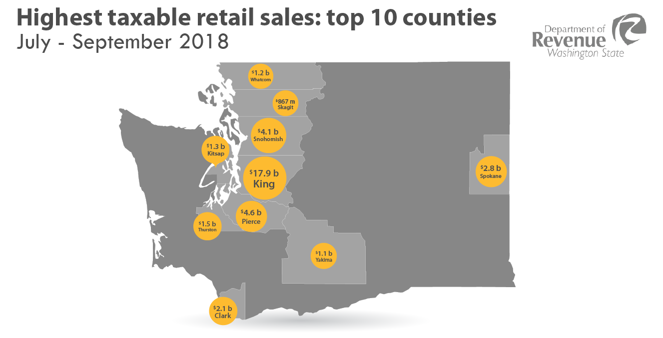 These figures are part of a quarterly report released today by the Washington State Department of Revenue. The taxable retail sales figures compare the same quarter year-over-year to equalize any seasonal effects that would influence consumer and business spending.