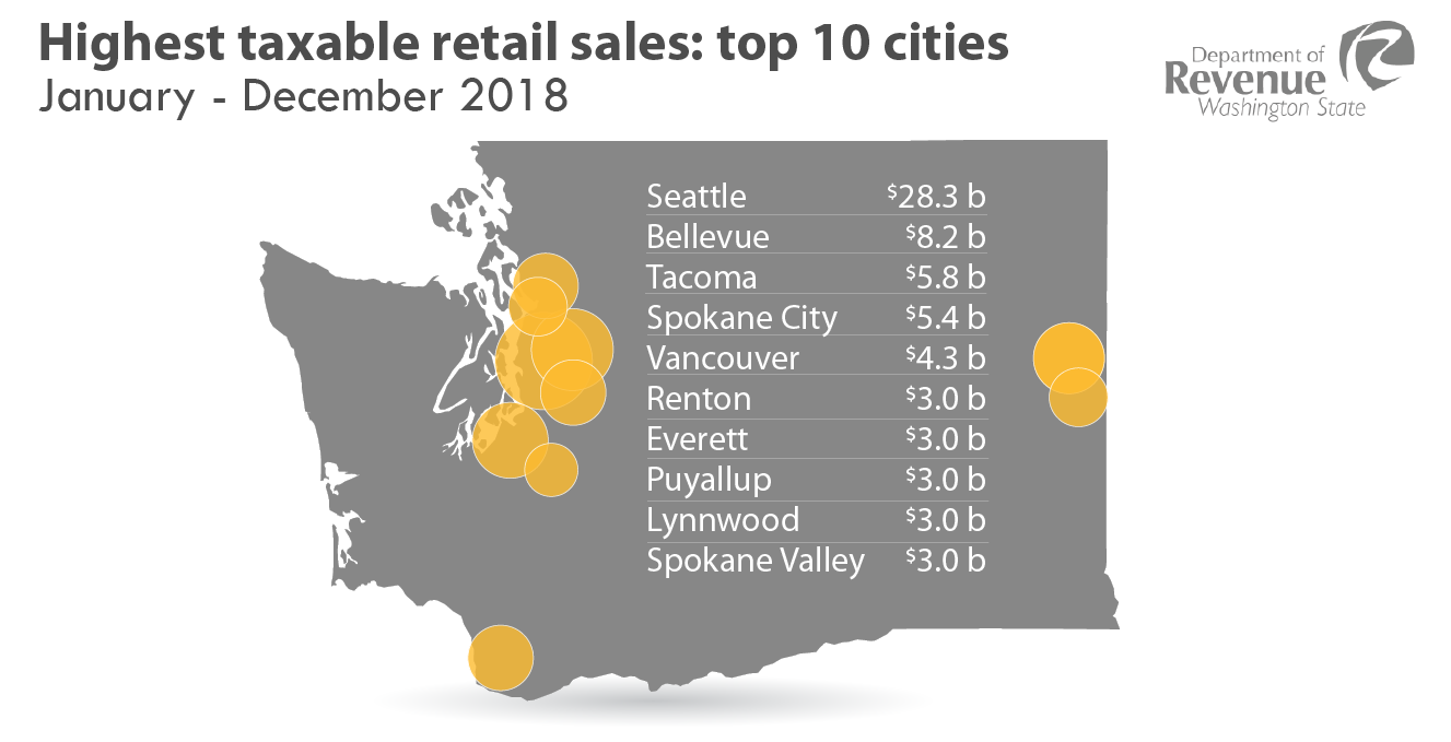 Of the top 10 most populated counties in the state, Clark and Kitsap counties enjoyed the largest overall taxable retail sales percentage increase. Of the most populated cities, Seattle and Vancouver saw the largest increase.