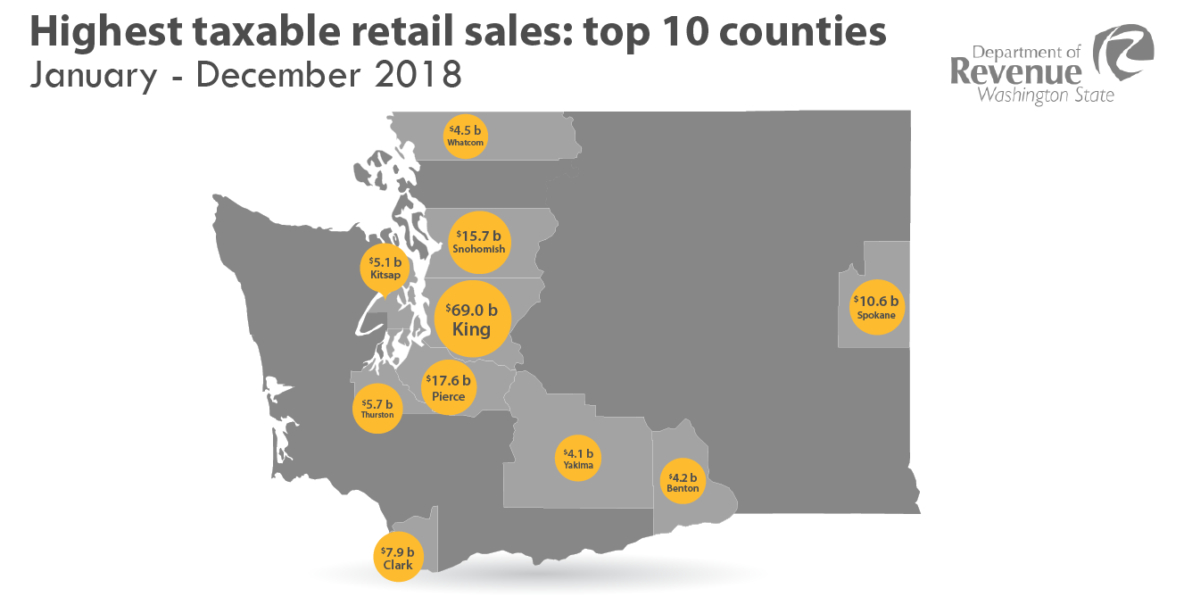 These figures are part of an annual report released today by the Washington State Department of Revenue. The agency reports on a quarterly and annual basis the total taxable retail sales reported by businesses on their Washington tax returns. The agency uses Census Bureau classifications to report the sales revenues by sector.