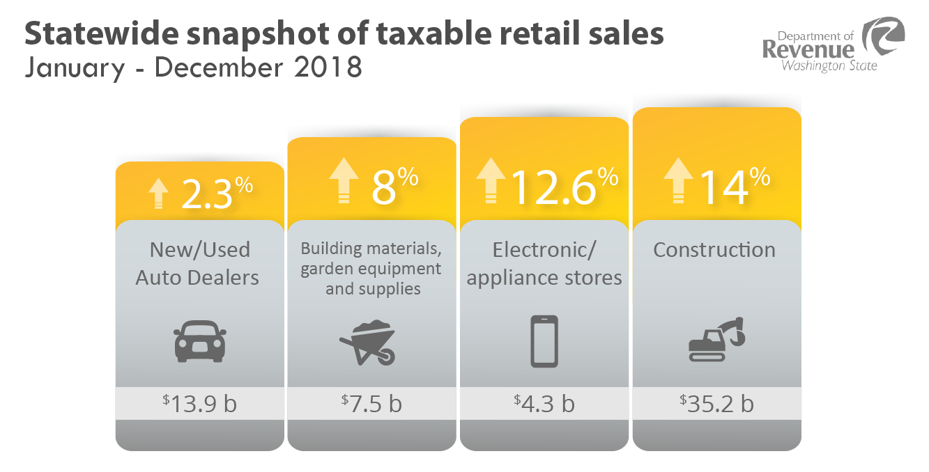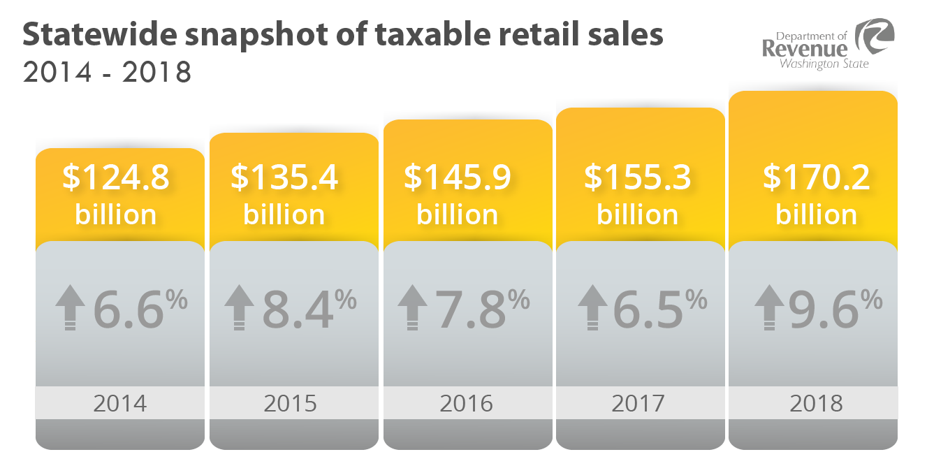 OLYMPIA, WASH. – May 16, 2019 – Continued gains in construction and auto sales sent taxable retail sales climbing once again to a record $170.2 billion in 2018, a 9.6 percent gain over 2017.