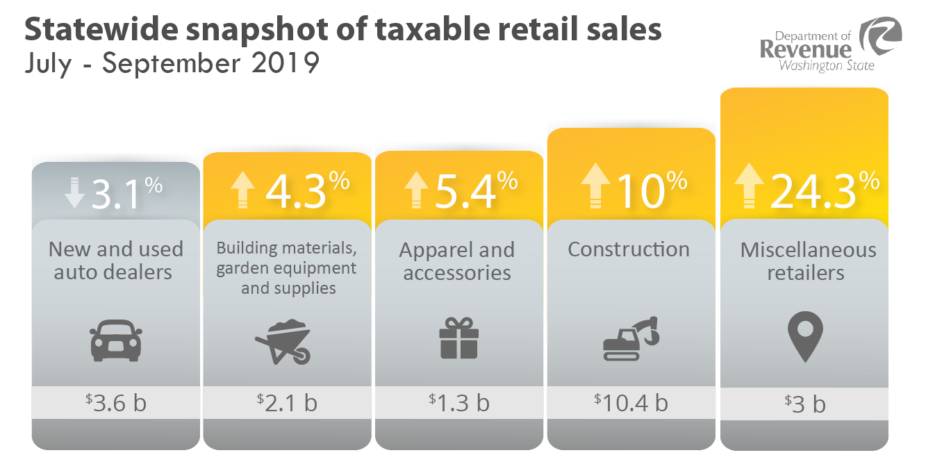 OLYMPIA, Wash. – Feb. 12, 2020 – The summer months of 2019 saw strong sales in construction and of building materials, garden equipment and supplies, boosting the state’s taxable retail sales in third quarter (July – September) 2019. The taxable retail sales increased by 7% in the third quarter of 2019 over the same period in 2018, reaching $47.9 billion.