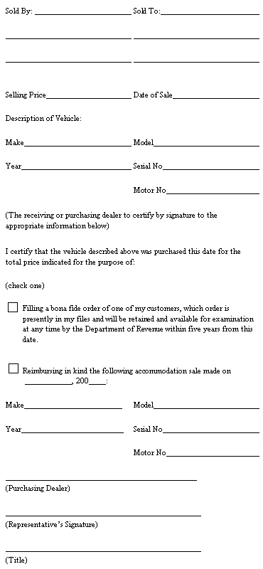 Accommodation sales must be documented. The original accommodation sale can be documented by obtaining a completed Motor Vehicle Accommodation Sale Invoice form from the receiving dealer. Note that the first box ("Filling a bona fide order") should be checked. In addition, the selling dealer must show that the amount charged to the receiving dealer did not exceed the cost of the vehicle.