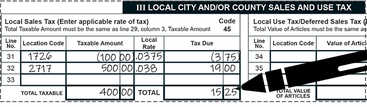 - Enter the total Taxable Amount of 400.00 and Total Tax Due City or Co. of $15.25.