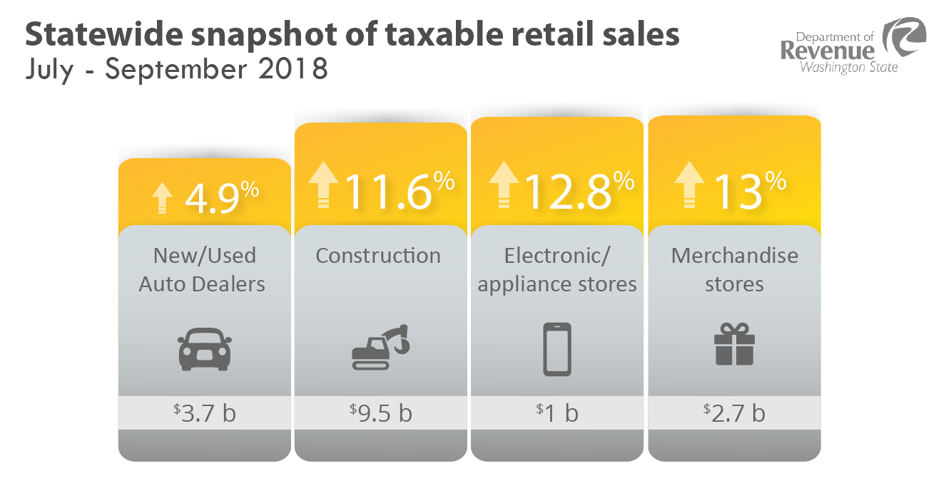 OLYMPIA, Wash. – Feb. 25, 2019 – Strong sales in construction and new and used automobiles continued to boost the state’s taxable retail sales in third quarter 2018. The taxable retail sales increased by 8.3 percent in the third quarter of 2018 over the same period in 2017, reaching $44.7 billion.