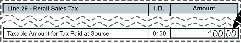 - On page 4 of the Deduction Detail, under Line 29 - Retail Sales Tax, enter the deduction amount of $100.00 next to Taxable Amount for Tax Paid at Source (I.D. 0130). If you do not have a copy of the Deduction Detail, go to the Excise Tax Returns and Addendums page, and select monthly, quarterly, or annual, based on your assigned filing frequency. Or call 360-705-6705 for help.